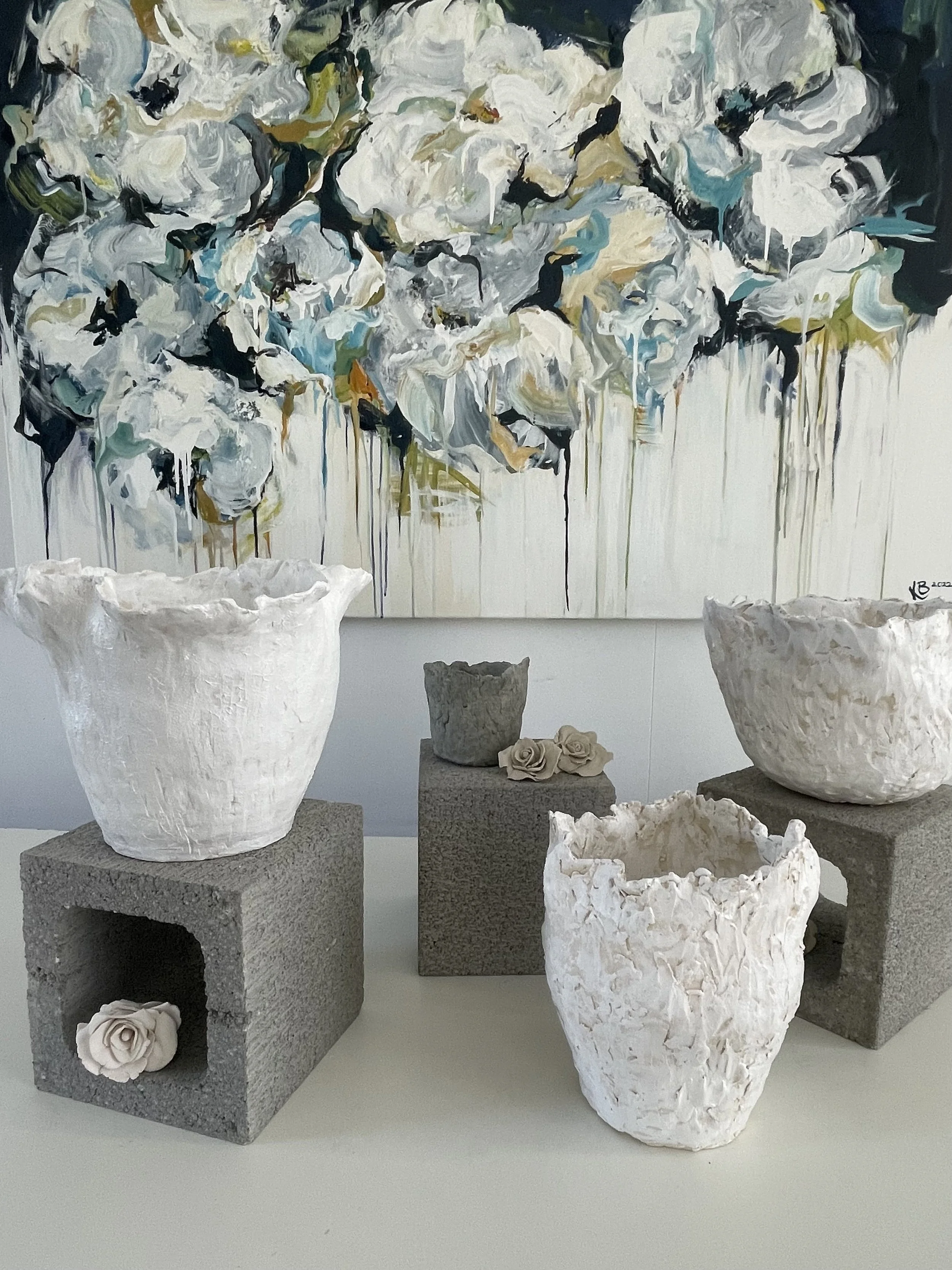 Usually, my large butcher’s bench heaves under the weight of tin buckets of fresh blooms, or if time permits, arranged in a collection of vases I scored from my late Mum or collected myself. And to be honest I’m not sure if in my process, the ceramics morph from the paintings or the paintings morph from the ceramics.